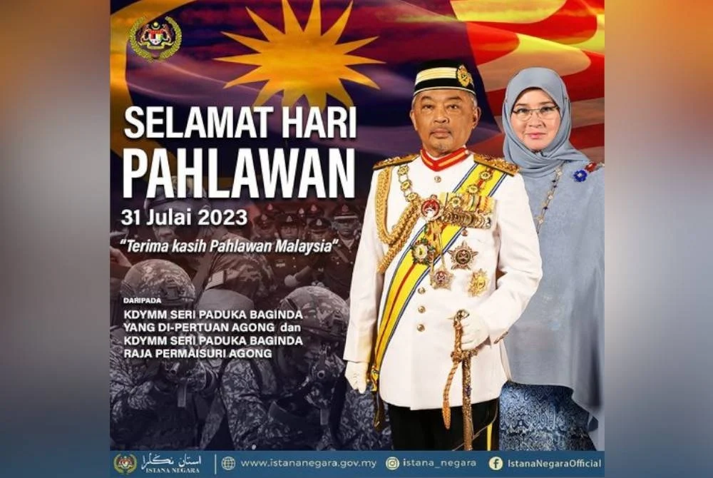 31 JUL: Yang di-Pertuan Agong Al-Sultan Abdullah Ri’ayatuddin Al-Mustafa Billah Shah dan Raja Permaisuri Agong Tunku Azizah Aminah Maimunah Iskandariah menzahirkan ucapan selamat Hari Pahlawan kepada seluruh warga Angkatan Tentera Malaysia (ATM) dan Polis Diraja Malaysia (PDRM).