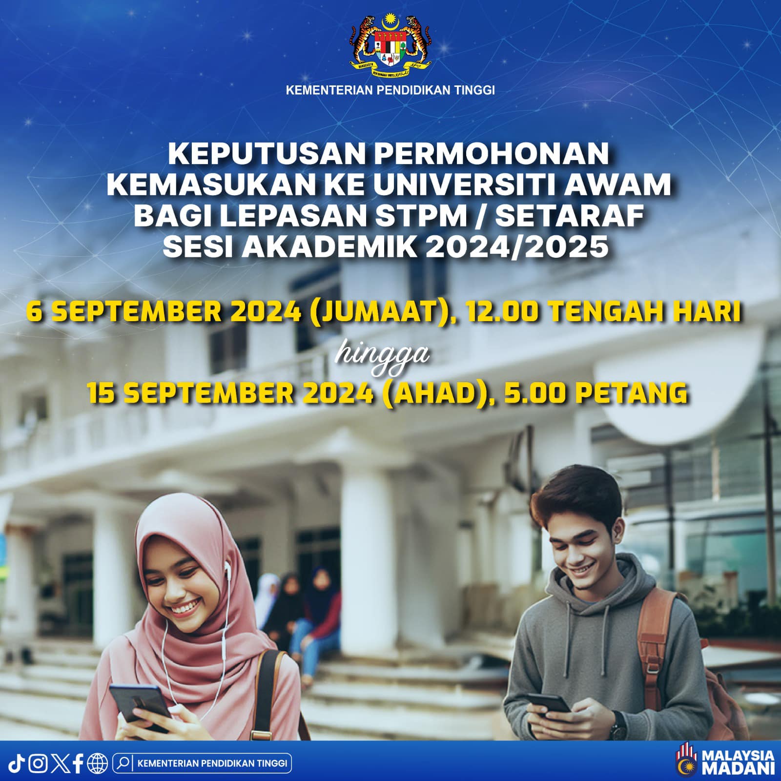 5 SEPT : Keputusan permohonan melanjutkan pengajian ke universiti awam (UA) peringkat sarjana muda sesi akademik 2024/2025 bagi lepasan Sijil Tinggi Persekolahan Malaysia (STPM) atau setaraf akan diumumkan esok.