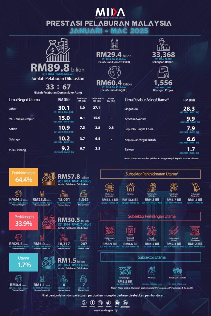 Lembaga Pembangunan Pelaburan Malaysia (MIDA) dalam satu kenyataan berkata pelaburan bagi Januari hingga Mac 2025 itu melibatkan sektor perkhidmatan RM57.8 bilion (64.4%), pembuatan RM30.5 bilion (33.9%) dan primer RM1.5 bilion (1.7%).
