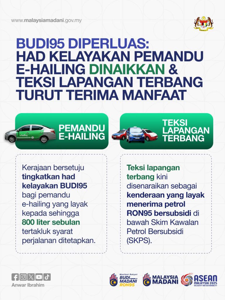 4 NOV : Pemandu e-hailing yang layak akan mula menerima penambahan kuota subsidi BUDI MADANI RON95 (BUDI95), pertengahan bulan ini.