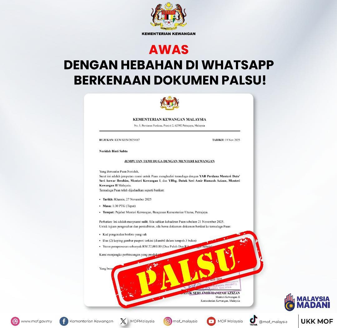“Orang ramai diingatkan agar tidak terpedaya atau menyebarkan dokumen palsu berupa surat kononnya dikeluarkan oleh MoF yang turut memaparkan Jata Negara dan telah tular melalui aplikasi WhatsApp.