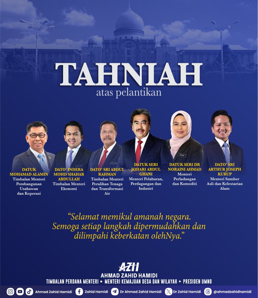 Tidak ketinggalan ucapan tahniah beliau untuk barisan timbalan menteri yang menerima amanah iaitu Datuk Mohd Shahar Abdullah (Timbalan Menteri Ekonomi), Datuk Mohamad Alamin (Timbalan Menteri Pembangunan Usahawan dan Koperasi) serta Datuk Seri Abdul Rahman (Timbalan Menteri Peralihan Tenaga dan Transformasi Air).