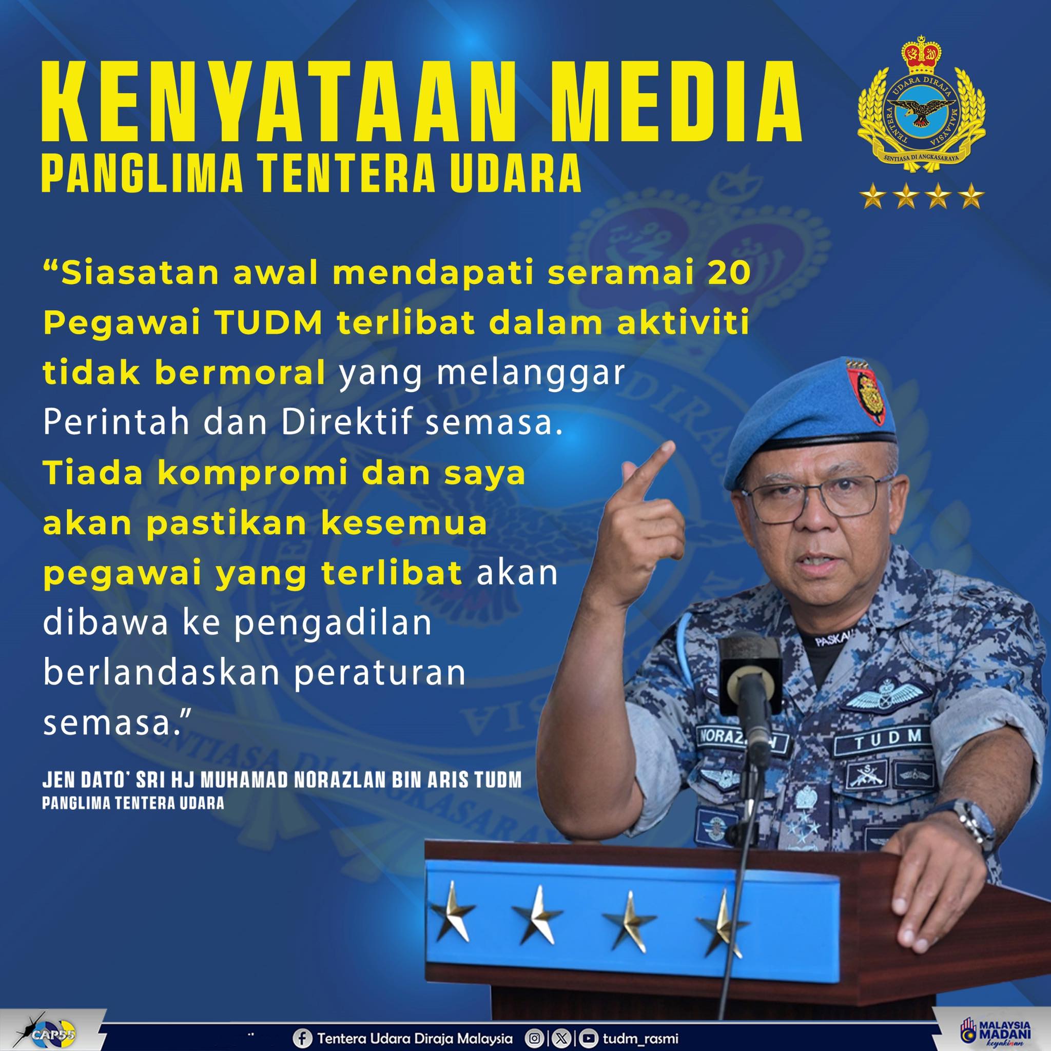 “Siasatan awal mendapati seramai 20 orang Pegawai TUDM yang telah terlibat secara langsung di dalam aktiviti tidak bermoral ini yang melanggar Perintah dan Direktif semasa.