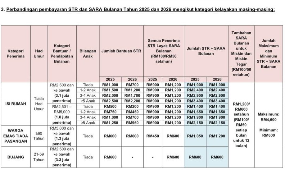 Menurut kenyataan itu, MoF berkata kerajaan menyusun semula pemberian STR dan Sumbangan Asas Rahmah (SARA) bagi tahun 2026 selaras usaha Kerajaan MADANI untuk memastikan inisiatif kerajaan dapat mengurangkan beban kos sara hidup secara lebih berkesan kepad arakyat.