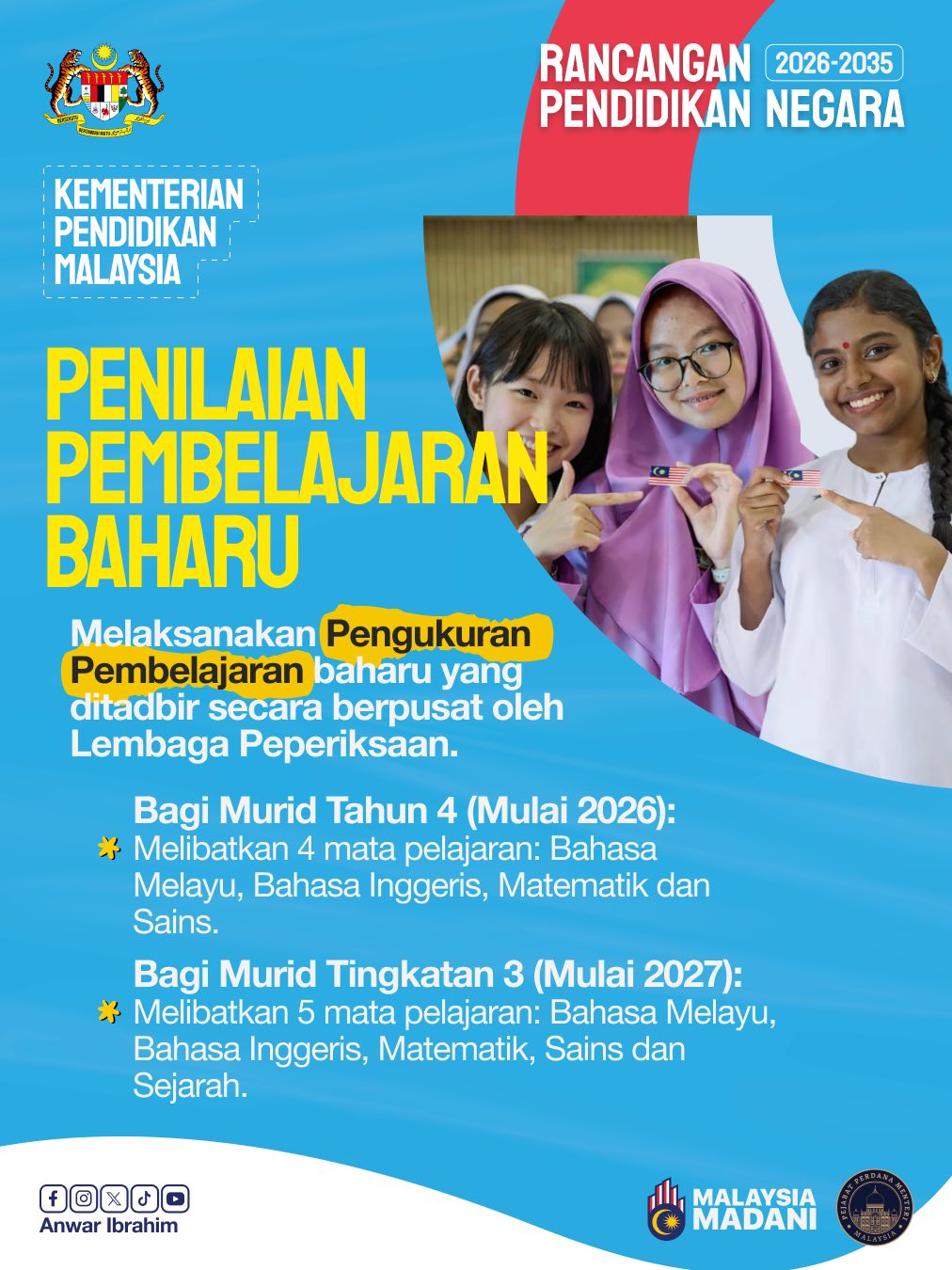 Semalam, Anwar mengumumkan beberapa inisiatif baharu dalam sistem pendidikan negara menerusi RPN 2026-2035 yang merangkumi kemasukan murid berumur 6 tahun ke Tahun Satu, pengenalan semula penilaian standard menerusi Pengukuran Pembelajaran Tahun Empat dan Pengukuran Pembelajaran Tingkatan Tiga serta penekanan terhadap subjek teras seperti Bahasa Melayu, Bahasa Inggeris, Matematik, Sains dan Sejarah.