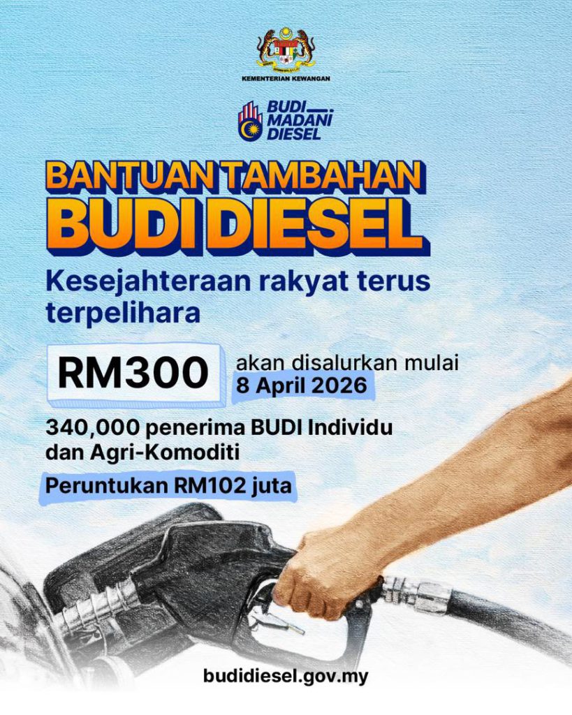 “Dalam suasana pasaran tenaga global yang semakin tidak menentu, Kerajaan MADANI mengambil langkah tegas bagi melindungi rakyat dengan mengekalkan bantuan BUDI Diesel pada kadar RM300 sebulan bagi April 2026.
