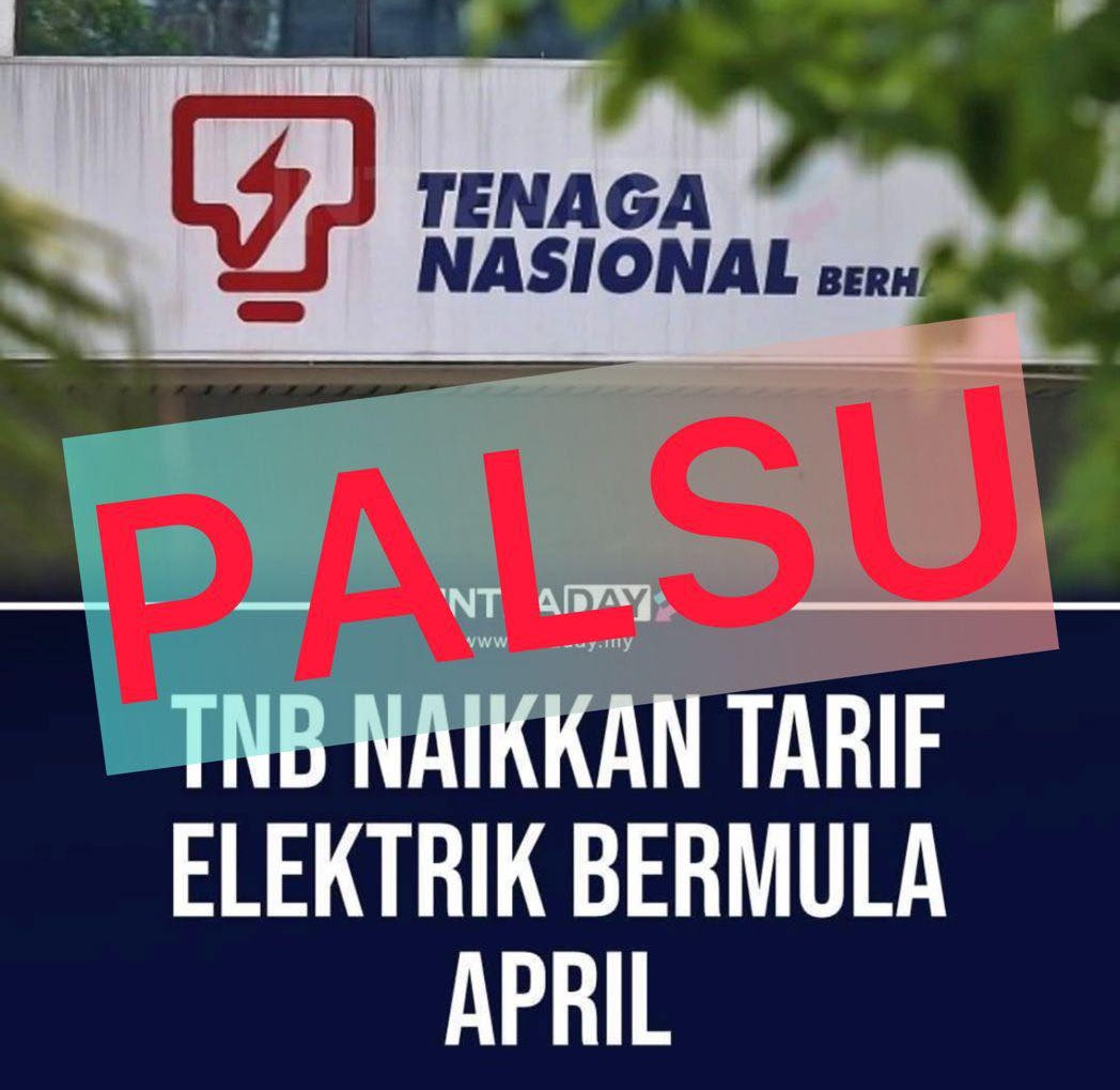 “TNB memandang serius mengenai mesej dan visual palsu tular yang mendakwa terdapat kenaikan tarif elektrik bermula April seperti yang dinyatakan.