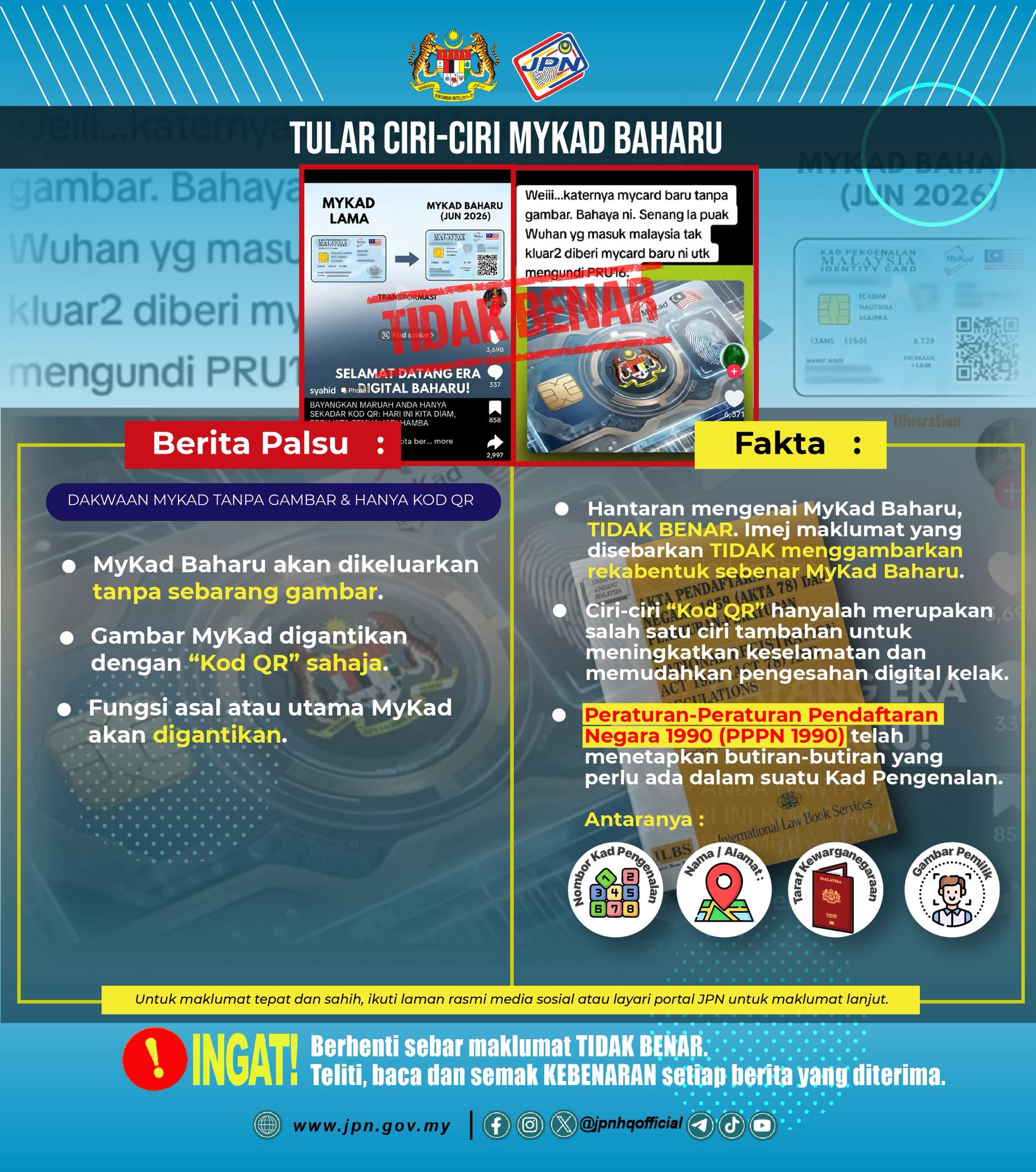 “Dakwaan bahawa MyKad baharu akan dikeluarkan tanpa gambar dan hanya mempunyai Kod QR adalah tidak benar.