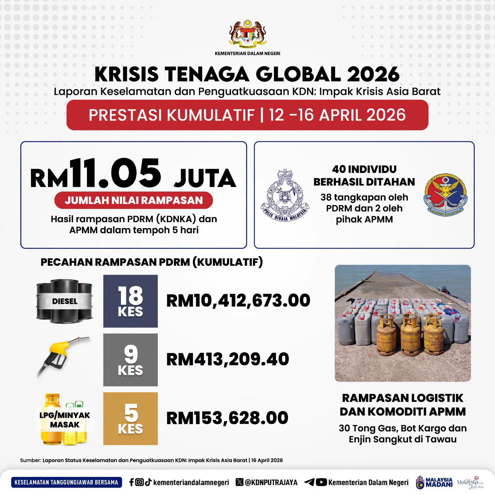 “Bagi tempoh 12 hingga 16 April 2026, tindakan tegas agensi penguatkuasaan mencatatkan RM11.05 juta jumlah keseluruhan nilai rampasan di mana 40 individu berjaya ditahan.